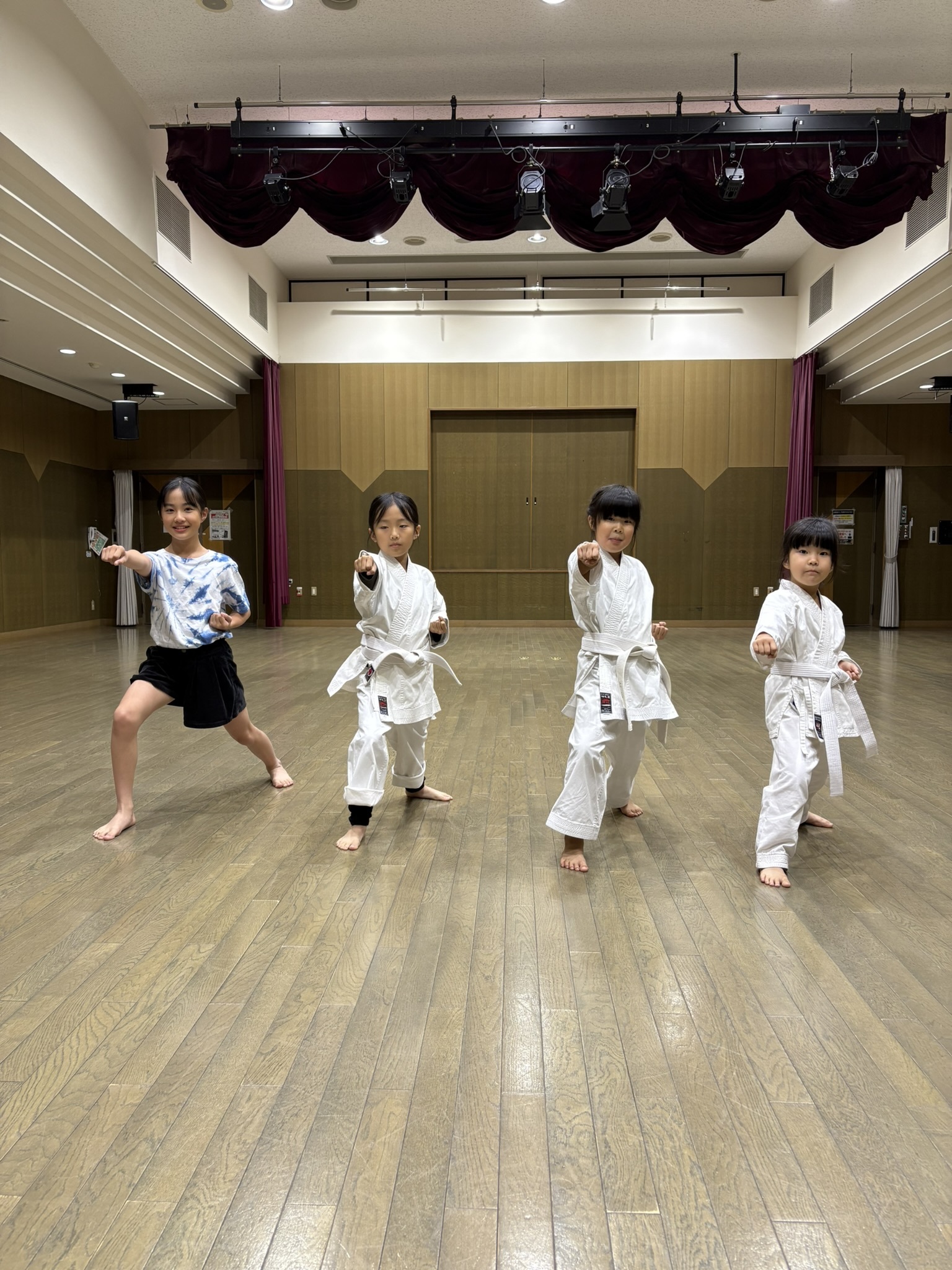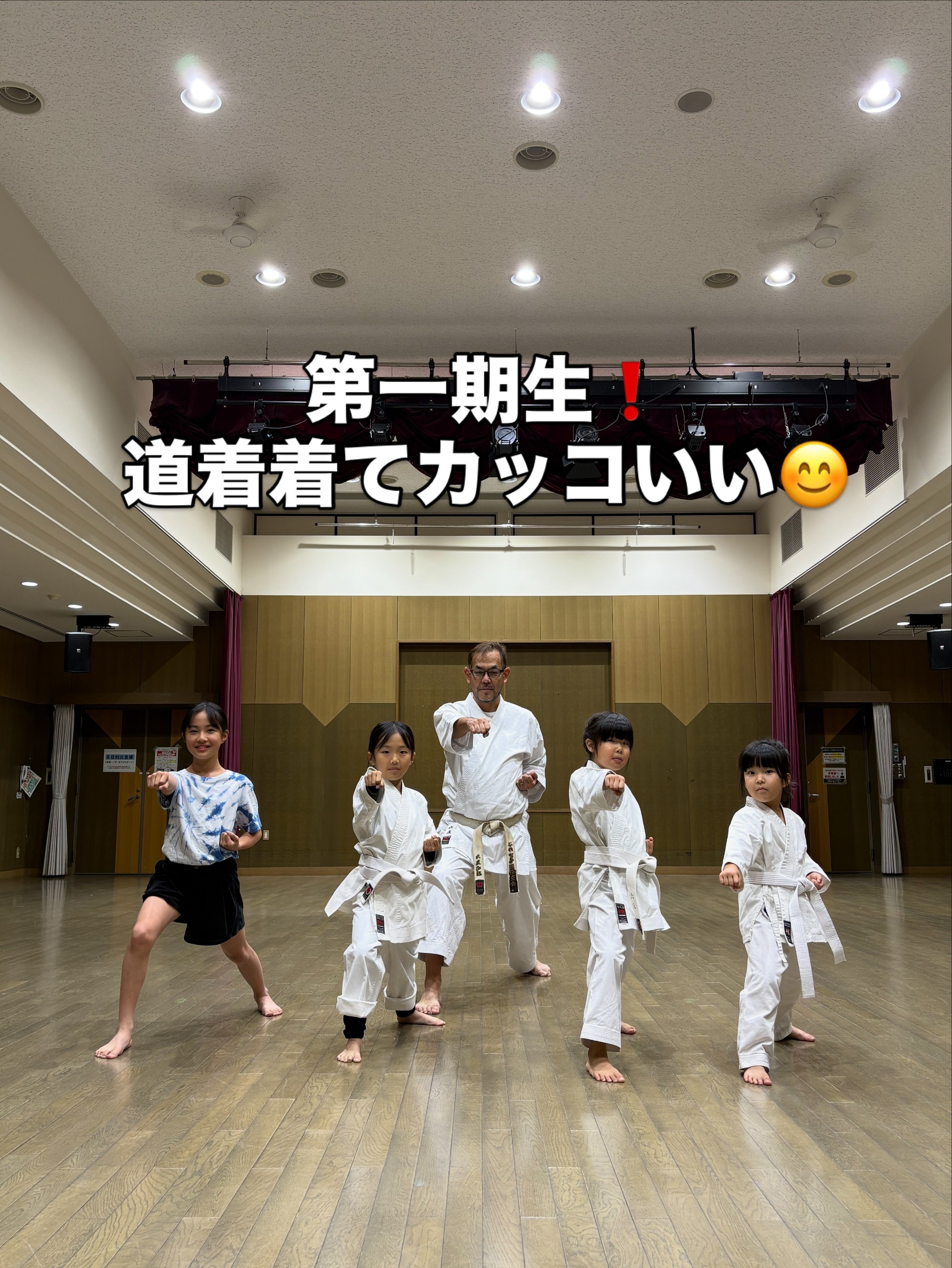 第一期生 入門! 初めての道着姿。照れながらも『エイ!』これからみんなで頑張ろう!